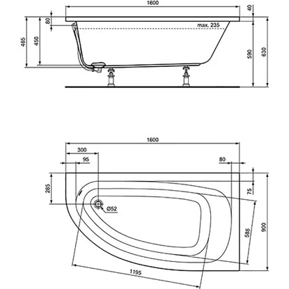 Ideal Standard Raumspar-Badewanne Hotline 1600 Mm X 900 Mm Asymetr. Rechts Weiß