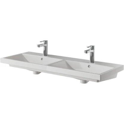 Two in one: Der elegante Doppelwaschtisch aus Keramik bietet viel edle Fläche und ist zugleich ein echter Hingucker.